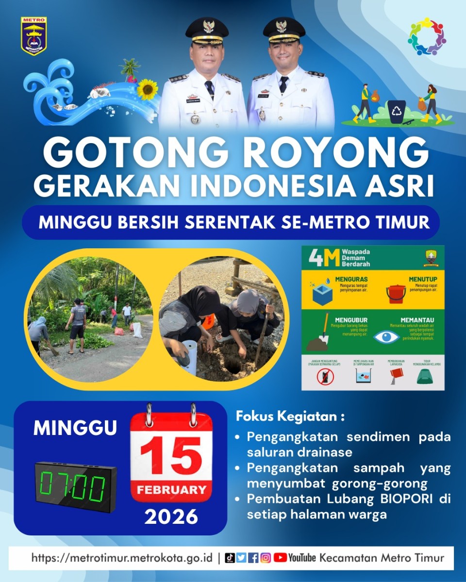 Metro Timur – Minggu, 15 Februari 2026, Kecamatan Metro Timur menghadirkan wajah baru gerakan gotong royong melalui Gerakan Indonesia ASRI (Aman, Sehat, Rapi, dan Indah) yang dilaksanakan serentak di lima kelurahan. Mengusung konsep Minggu Bersih Terpadu, kegiatan ini tidak sekadar kerja bakti, tetapi menjadi gerakan kolaboratif berbasis kebutuhan wilayah.