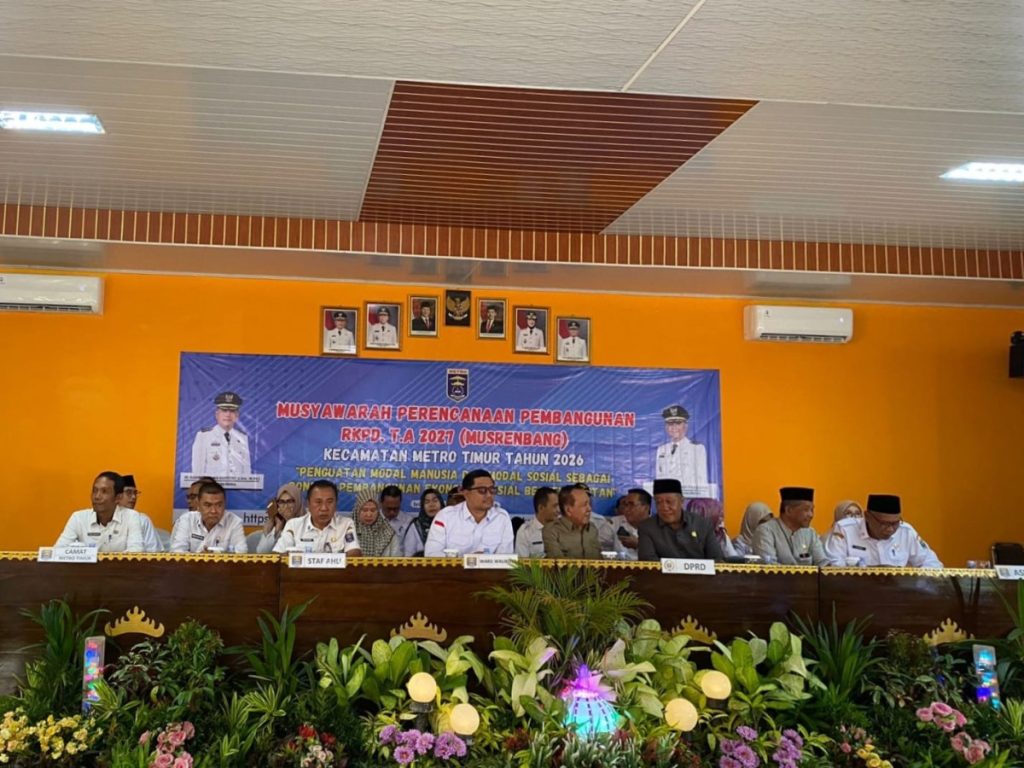 Metro Timur, 28 Januari 2026 — Pembangunan yang kuat tidak hanya bertumpu pada infrastruktur, tetapi juga pada kualitas manusia dan kekuatan sosial masyarakat. Semangat inilah yang mengemuka dalam Musyawarah Perencanaan Pembangunan (Musrenbang) RKPD Tahun Anggaran 2027 Kecamatan Metro Timur yang digelar di Aula Kantor Kecamatan Metro Timur.
