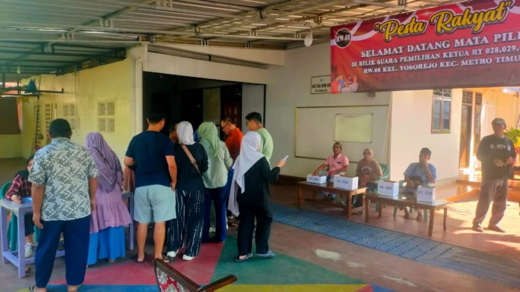 Metro Timur — Minggu, 7 Desember 2025, halaman Pasar Seger Kelurahan Yosorejo dipenuhi suasana meriah dan kebersamaan. Warga RW 08 meliputi RT 28, 29, 30, dan 31 menggelar Musyawarah Pemilihan Ketua dan Pengurus RT secara serentak, sebuah tradisi demokrasi tingkat lokal yang dibalut dengan kreativitas dan kekompakan warga.