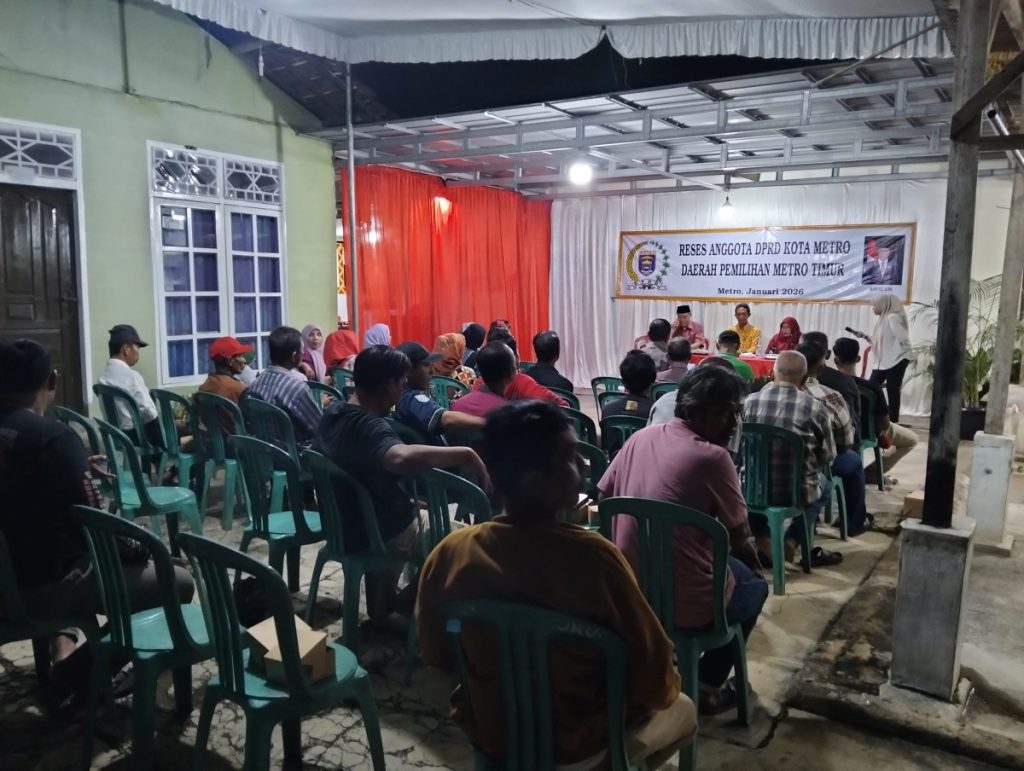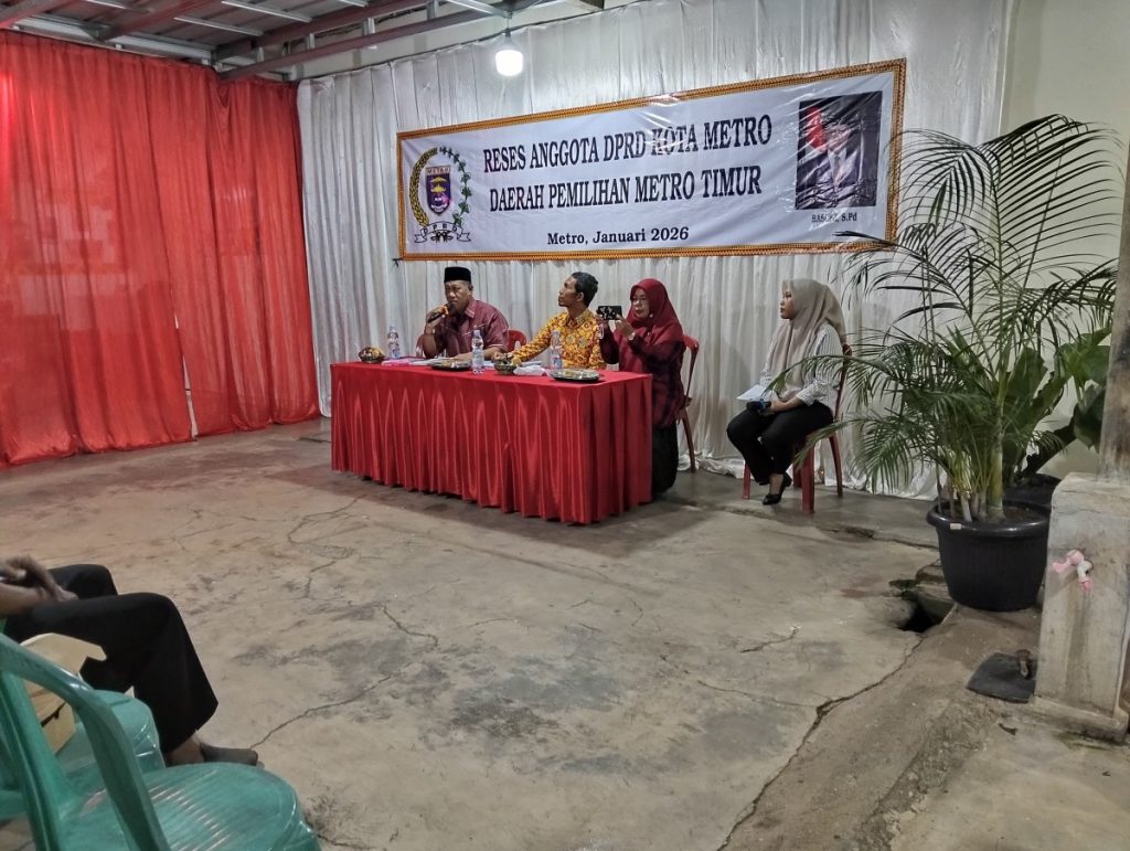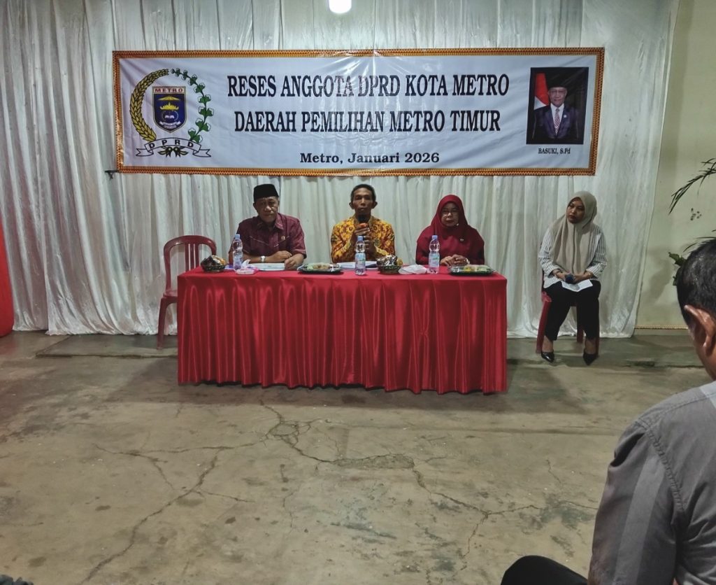 Metro Timur — Pemerintah Kecamatan Metro Timur terus memperkuat sinergi dengan legislatif dalam menyerap aspirasi masyarakat. Hal tersebut terlihat dalam kegiatan Reses Anggota DPRD Kota Metro Daerah Pemilihan (Dapil) Metro Timur yang dihadiri langsung oleh Camat Metro Timur, Jum’at, 30 Januari 2026, bertempat di kediaman Bapak Hariyanto, S.H., Jalan Satelit II Nomor 38, Kelurahan Iringmulyo.