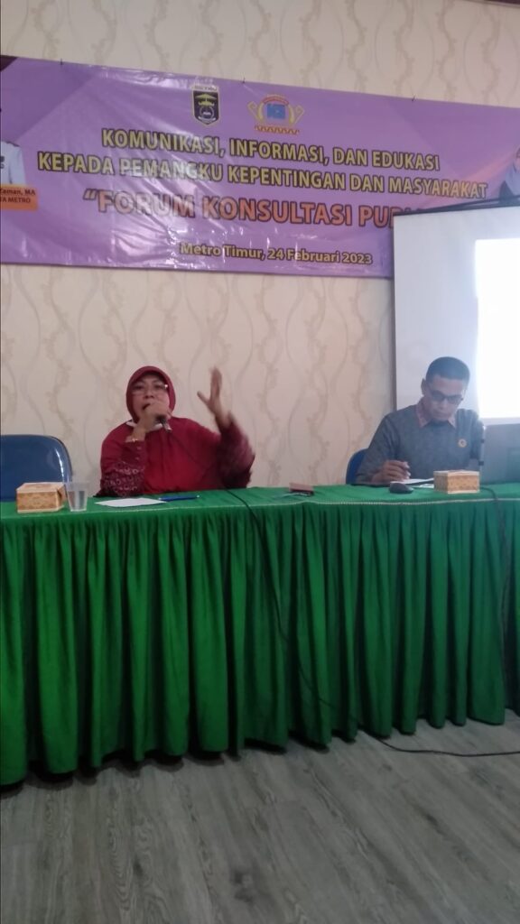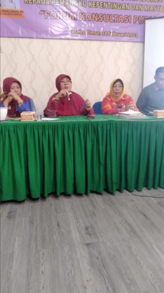 Kegiatan tersebut turut mengundang Camat Se-Kota Metro, Lurah Se-Kota Metro, Kepala UPTD TK, SD, SMP, SMA, Kota Metro, Kepala UPTD Puskesmas Kota Metro, RT/RW Kota Metro, dan tokoh masyarakat Kota Metro. Kegiatan Forum Konsultasi Publik tersebut dilaksanakan secara bergilir sesuai dengan jadwal undangan yang telah disampaikan kepada masing-masing pihak yang berkepentingan.